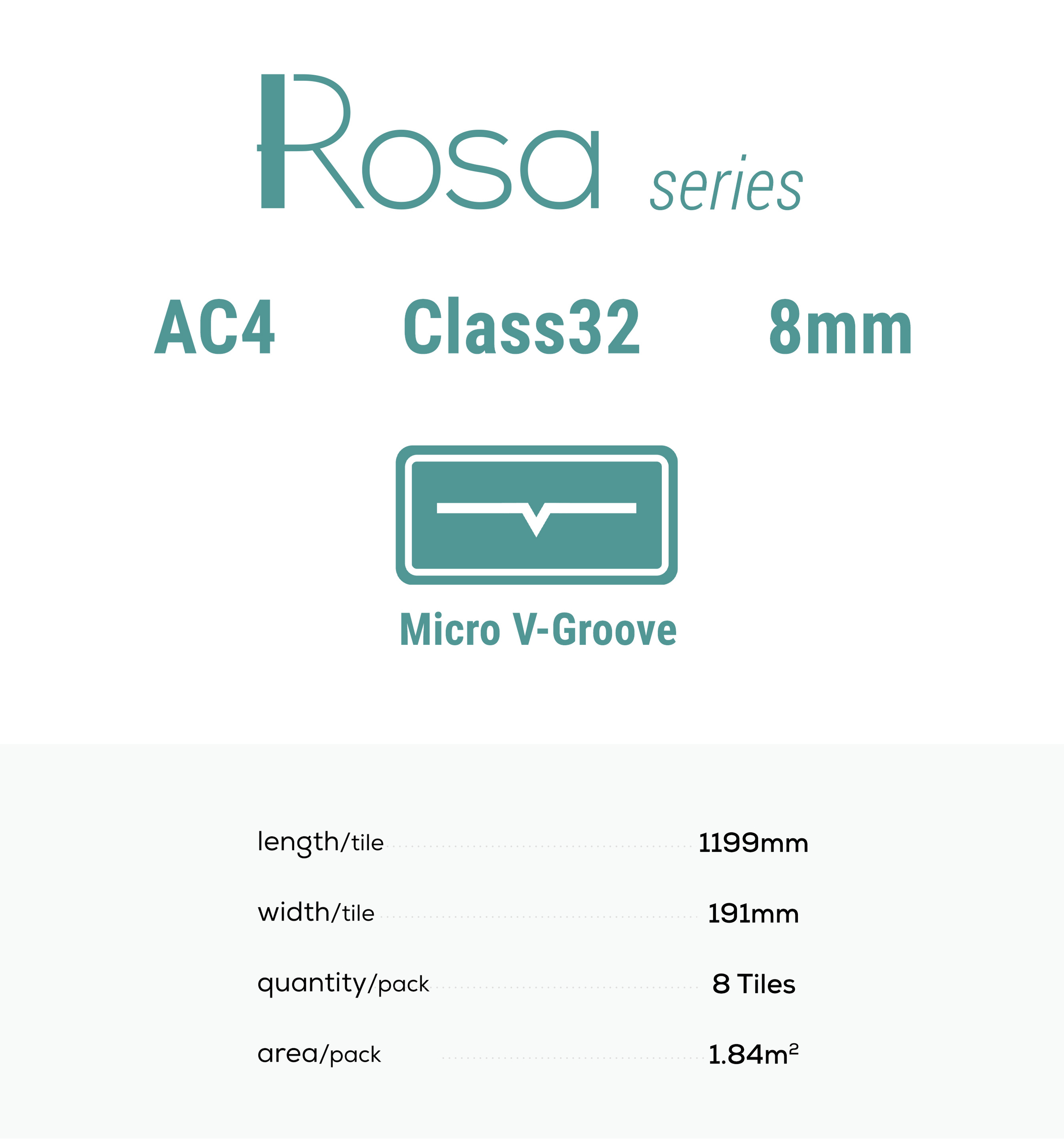 - در زمان خرید این نمونه پارکت و یا هر محصول دیگر, لازم است مشخصات فنی آن را مد نظر قرار دهید. ابعاد, ضخامت, متراژ و ویژگیهایی از این دست را میتوان در رده مشخصات فنی دسته بندی کرد. پارکت رزا با مقاومت سایشی AC4 جز مقاومترین انواع پارکتها دسته بندی میشود. کلاس تردد این محصول 32 بوده و با ضخامت 8 میلیمتر ساخته شده است. ضخامت مناسب این محصول باعث شده است تا نصب آن به صورت یکنواخت و زیبا انجام شود.